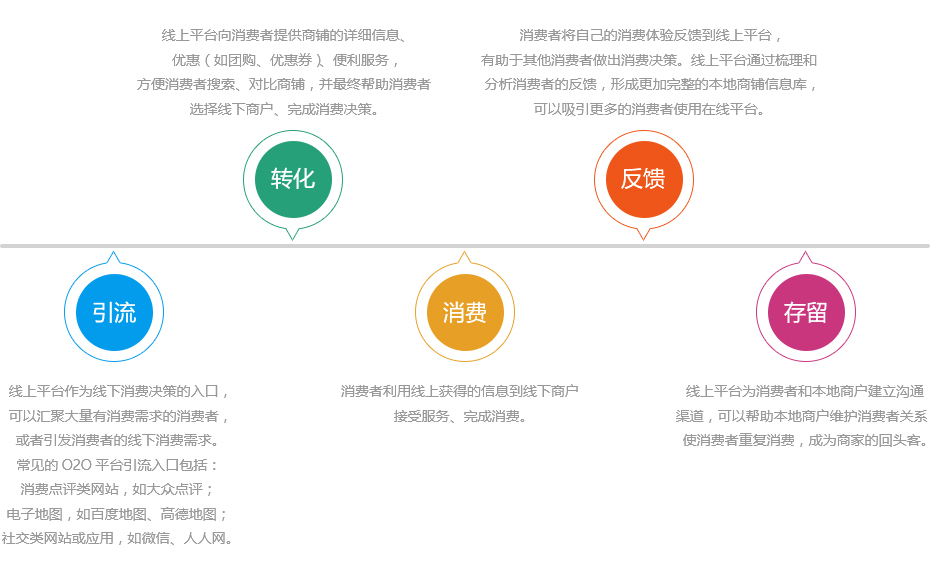 即online To Offline,也即将线下商务的机会与互联网结合在了一起,让互联网成为线下交易的前台。商家通过在网上开店将商家信息、商品信息等展现给消费者,消费者通过线上筛选服务,线下比较、体验后有选择地消费,在线下进行支付。